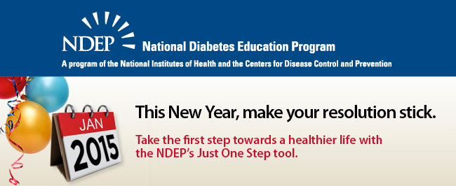 | The New Year is the perfect time to make a healthy change in your life. Need some help making a plan and sticking with it? NDEP’s Just One Step tool can help you break down your goals for making modest but important lifestyle changes into small, achievable steps. These small changes—such as losing a small amount of weight, if you are overweight; becoming more active; and making healthy food choices to cut back on calories—can go a long way toward preventing type 2 diabetes as well as managing the disease. Take your first step today! For more information visit YourDiabetesInfo.org/JustOneStep. |